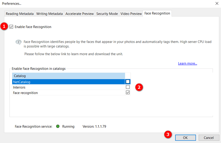 Daminion zeigt die Liste der verfügbaren Kataloge an, damit Sie entscheiden können, in welchen Katalogen die Gesichtserkennung aktiviert werden soll.