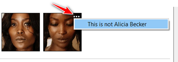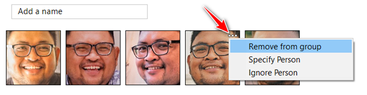 Wenn ein oder mehrere Gesichter falsch in der aktuellen Gruppe platziert sind, bewegen Sie den Mauszeiger über die Miniaturansicht und klicken Sie auf das Drei-Punkte-Symbol, um das erkannte Gesicht aus dieser Gruppe zu entfernen, eine Person anzugeben oder das erkannte Gesicht zu ignorieren.