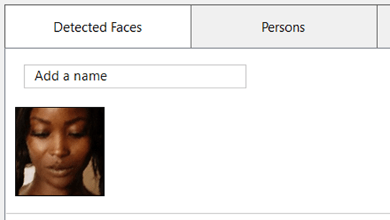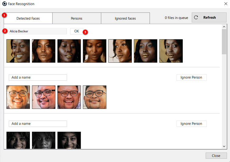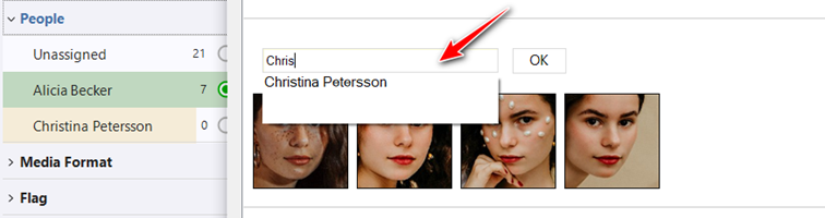 Klicken Sie auf „Erkannte Gesichter“, um den Namen einer Person einer Gruppe von Dateien zuzuweisen. Geben Sie den Namen ein und klicken Sie auf die Schaltfläche „Ok“.