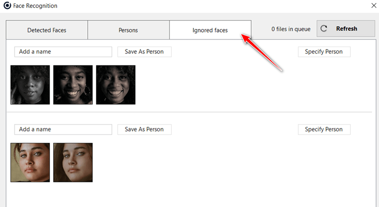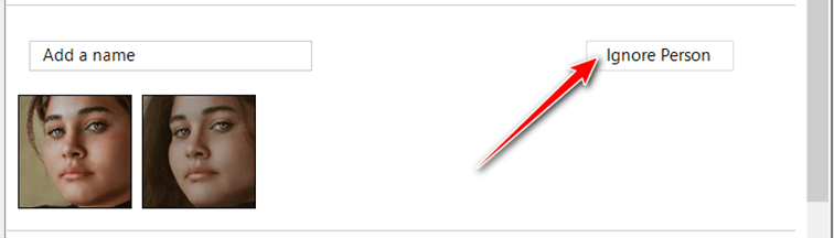 Wenn Sie den Namen der erkannten Person nicht kennen, können Sie die gesamte Gruppe der Gesichter als ignoriert markieren, indem Sie auf die Schaltfläche „Person ignorieren“ klicken.