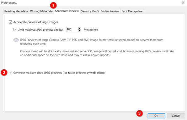 Hinweis: Um eine korrekte Funktion des Daminion-Gesichtserkennungsmoduls zu gewährleisten, aktivieren Sie bitte die Option „JPEG-Vorschauen mittlerer Größe erstellen“ über das Verwaltungspanel des Daminion Servers > Administration > Einstellungen > Vorschau beschleunigen.