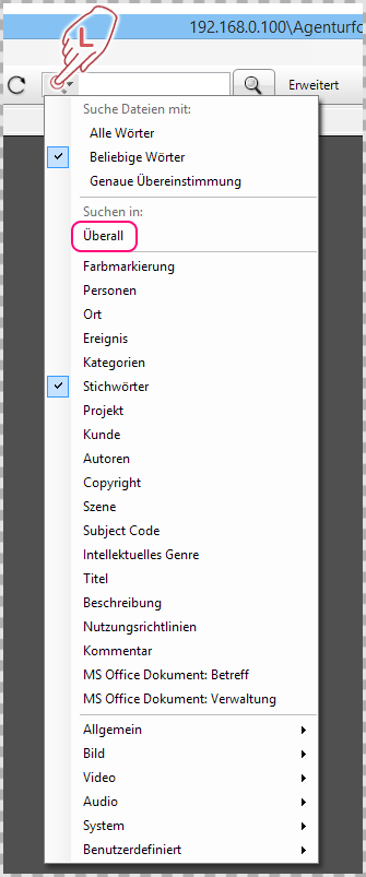 Mit Klick auf das kleine Lupensymbol auf der linke Seite, öffnet sich eine Liste, in der Sie festlegen können, in welchen Metadatenfeldern nach dem Begriff gesucht werden soll.