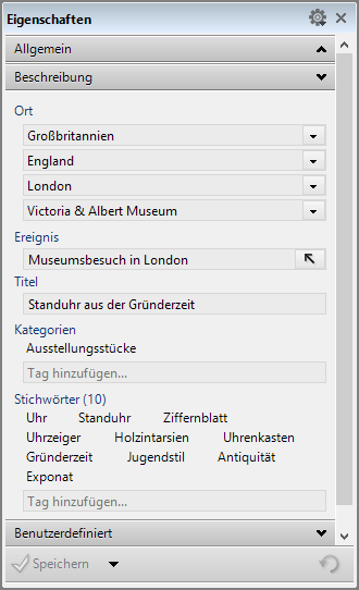 Dazu gehören allgemein beschreibende Tags wie z.B. Beschreibung-, Titel- oder Ereignis-Tag oder ortsbeschreibende Tags wie Ort, Stadt, Land, aber auch spezifischere Tags wie z.B. die Kategorie- oder Stichwort-Tags.